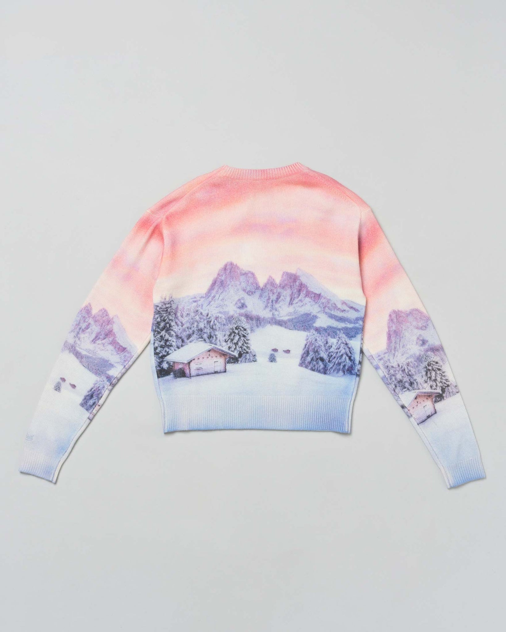 Maglioncino in misto lana, viscosa e cashmere con grafica all-over con chalet, tramonto e montagna innevata, scritta Winter mood applicata sul petto. Collo, fondo e polsi rifiniti a costa larga.